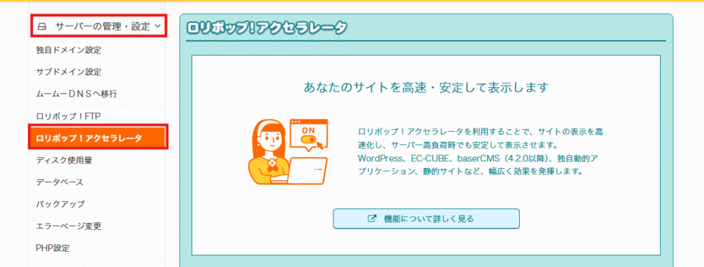 ロリポップ!の場合「ロリポップ!アクセラレータ」という機能が用意されており、ドメイン単位でON/OFFできます。WordPressをインストールした際に自動で有効になっている場合があるので、反映されないときは管理画面から確認してみてくださいね。