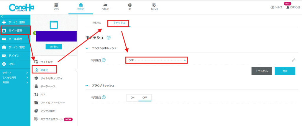 ConoHa WINGの場合「コンテンツキャッシュ」という機能がデフォルトでONになっています。管理画面の「サイト管理 → 高速化 → キャッシュ」から確認・クリアができます。