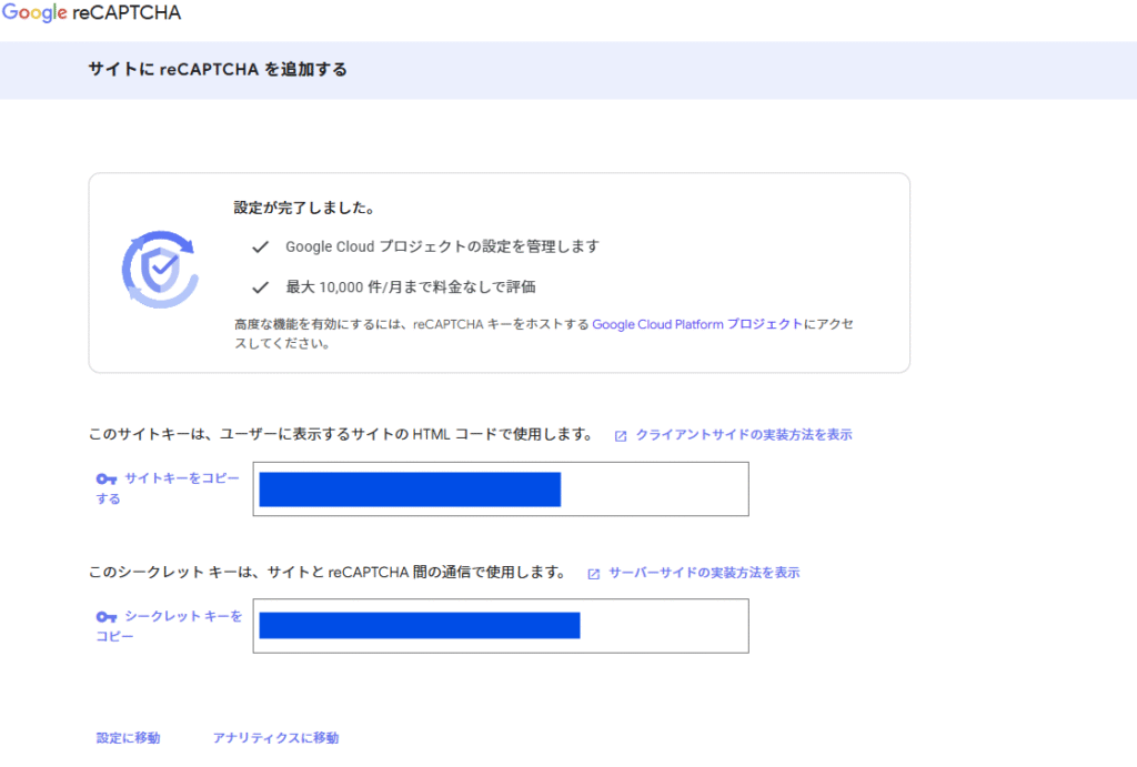 セットアップが完了すると、「reCAPTCHA はこのサイト上で有効化されています。」と表示される。