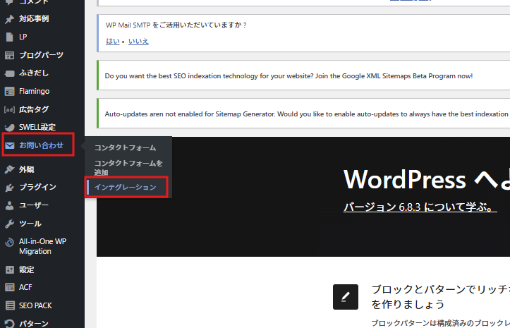※この画面はContact Form 7のプラグインを使用している場合の方法です。他のプラグインの場合は本記事では解説をしていないので、別途確認をお願いします。