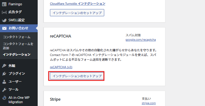 reCAPTCHAの項目で「インテグレーションのセットアップ」をクリックする。