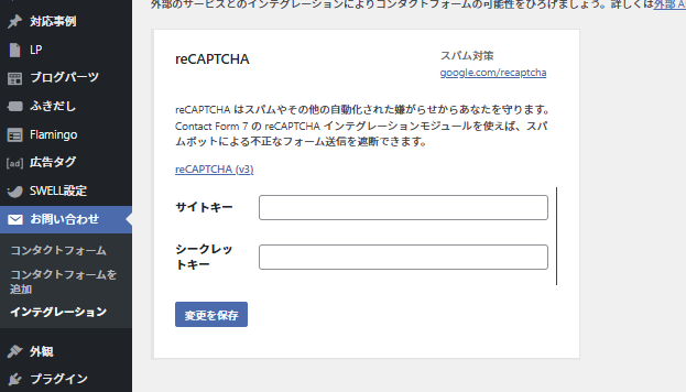 ステップ2のサイトキーとシークレットキーを入力し、変更を保存をクリックする。